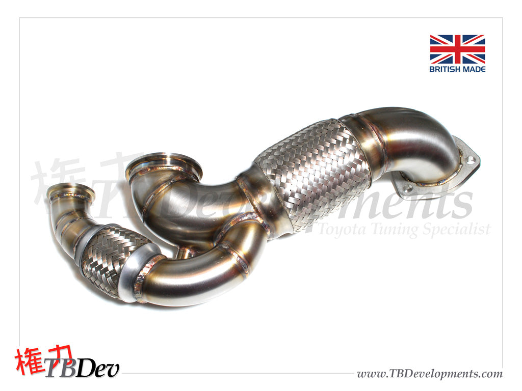 - Full 316 Stainless steel V-Band downpipe using a flexible section to account for vibration and thermal expansion, Comes with either a rerouted or screamer pipe external wastegate dump tube.